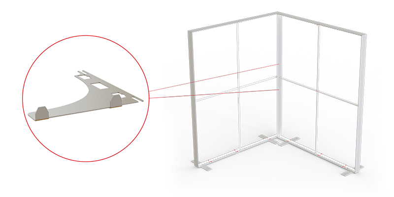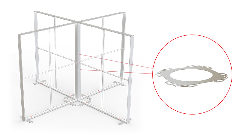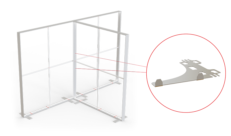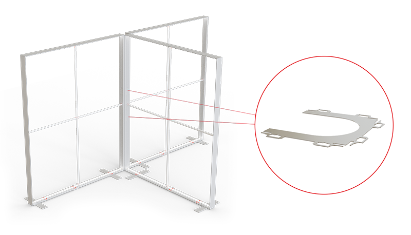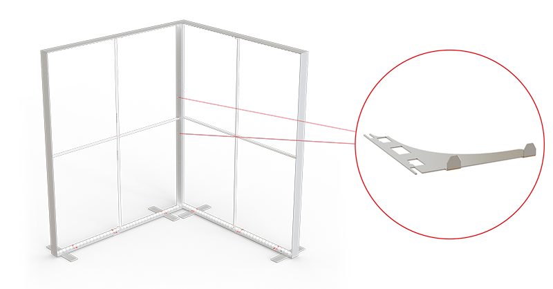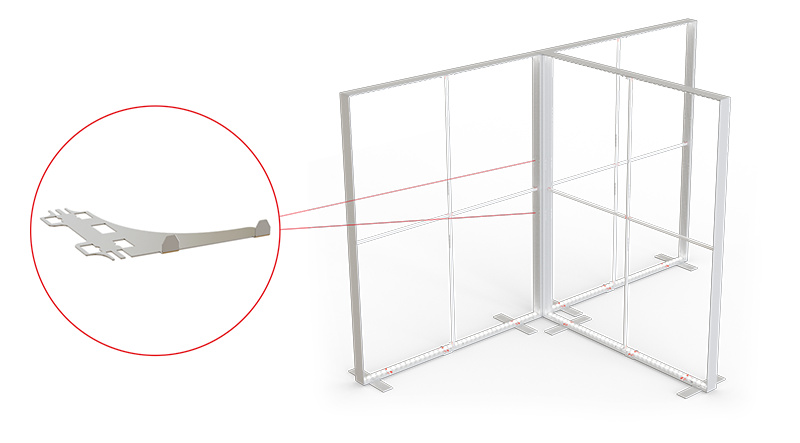 Mit verschiedenen Systemverbindern, die zwischen die vertikalen Systemkomponenten eingesetzt werden, können Sie Rückwände in unterschiedlichen Formen leicht verbinden. Diese Zubehörteile ermöglichen es Ihnen auch, Rückwände in verschiedenen Formen wie L-, U-, T-, Kreuz- oder Sternformen zu gestalten.
