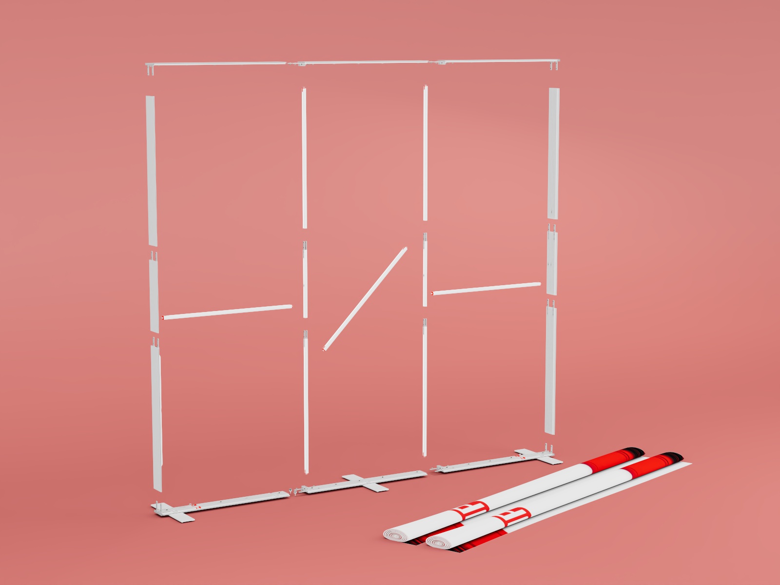 Entnehmen Sie die Teile einfach aus dem handlichen ABS-Koffer, stecken Sie diese zusammen, befestigen Sie die Standfüße – und schon ist das Display einsatzbereit. Die Digitaldrucke mit angenähten Silikonlippen lassen sich mühelos anbringen, leicht handhaben und jederzeit eigenständig austauschen.