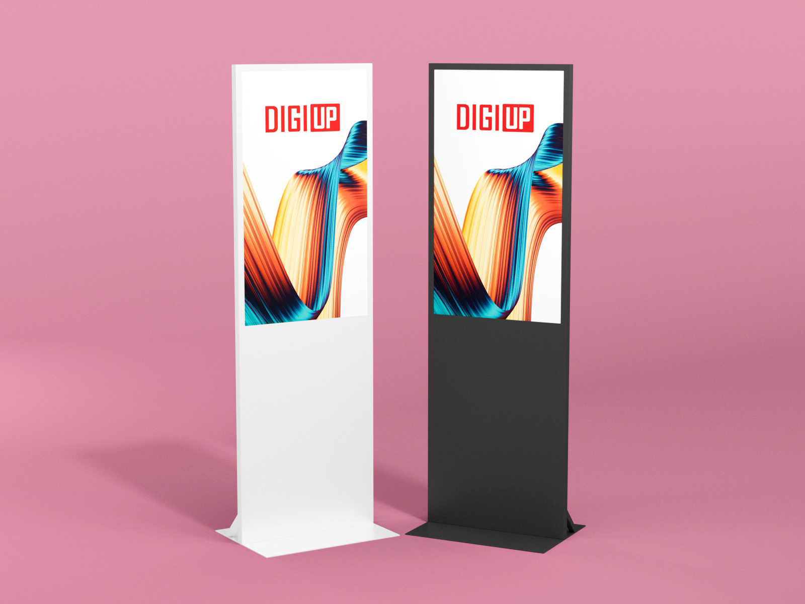 Optional gibt es die Bodenplatte auch mit Rollen. Die DIGIUP Stele ist in den Standardfarben Schwarz oder Weiß erhältlich.