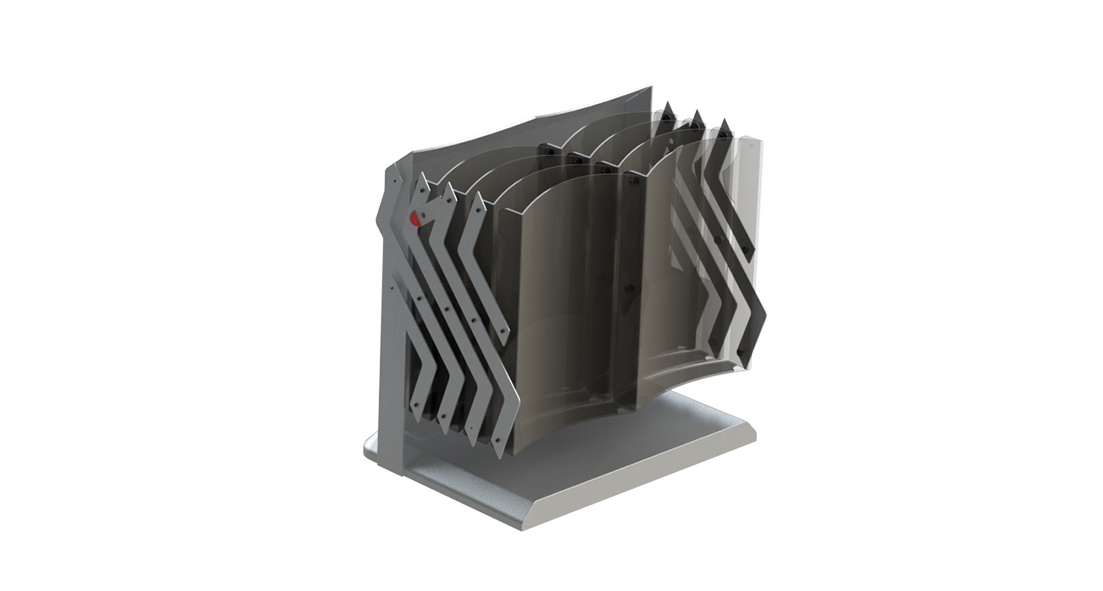 Der Brochure EASY UP BIG ist ein faltbarer Prospektständer für acht A4-Broschüren. Die Seitenteile und die Frontplatte bestehen aus Aluminium, während die Basis aus silber lackiertem Holz gefertigt ist.