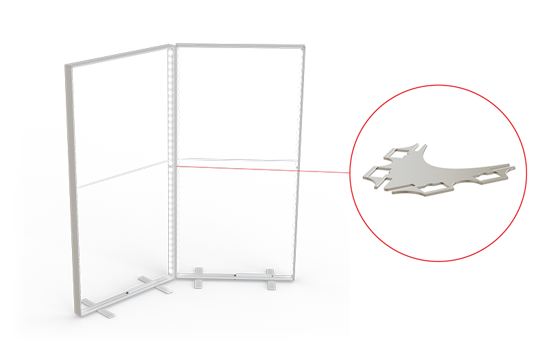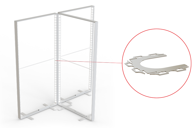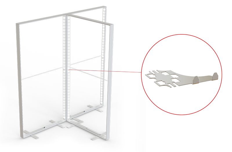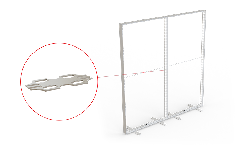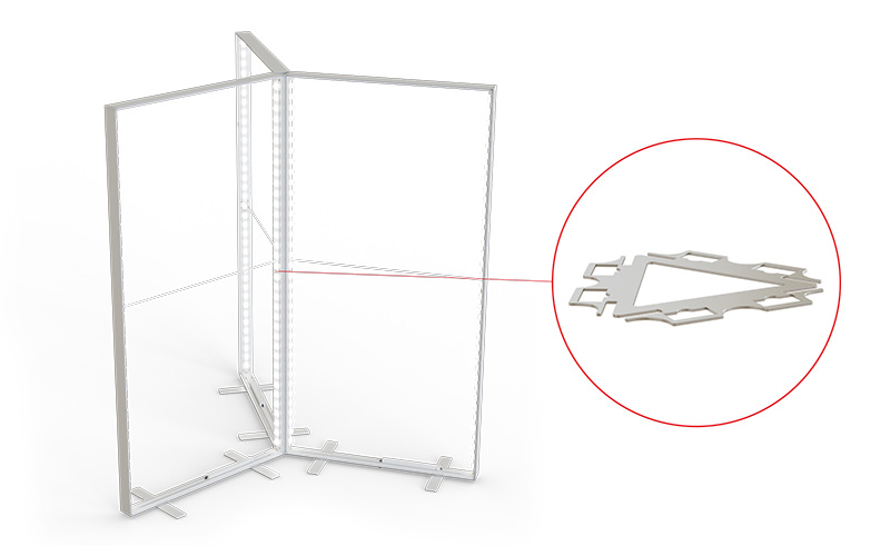 Der gerade Systemverbinder ermöglicht es, mehrere Systeme in kürzester Zeit zu beliebiger Länge und zu geraden Wänden zu verbinden. Der Verbinder wird zwischen den vertikalen Systemkomponenten eingefügt und garantiert eine stabile Verbindung zwischen den Systemen.
