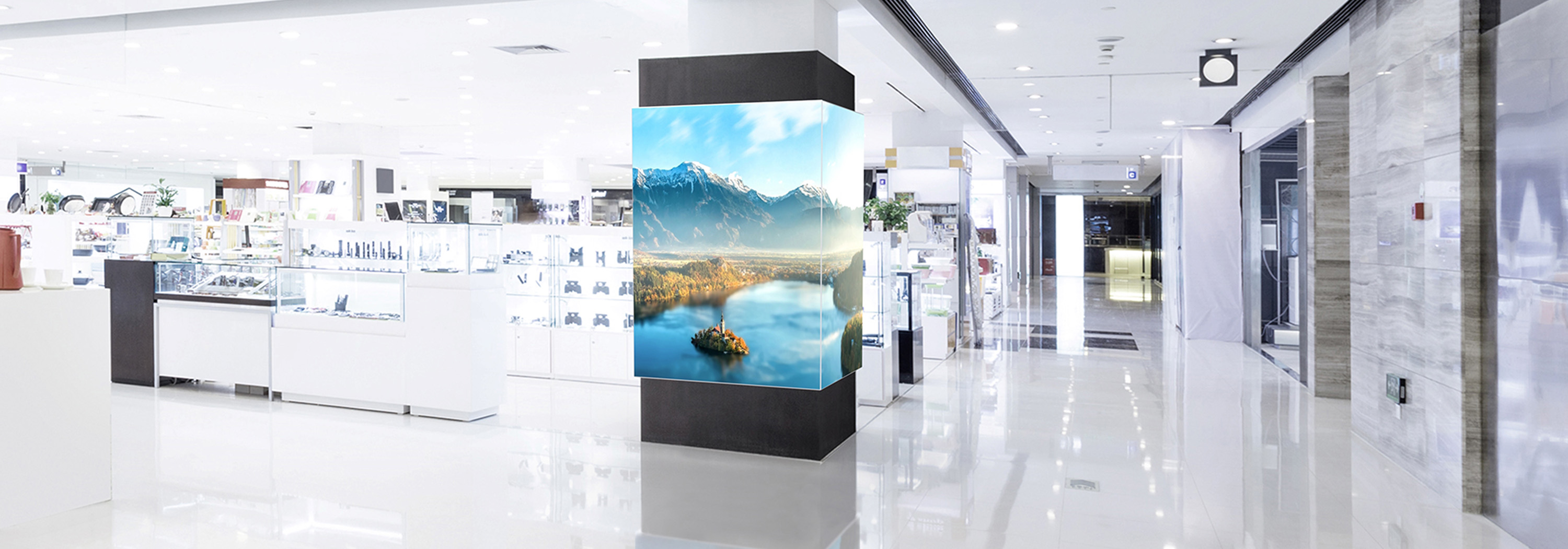 Der Multi Tower Pillar ermöglicht es, Säulen komplett zu verkleiden und schafft so eine beeindruckende Werbefläche, die durch LED-Hintergrundbeleuchtung noch imposanter wirkt. Bei beleuchteten Anwendungen muss ein Abstand von 6,5 cm zwischen der Säule und der Verkleidung eingehalten werden, um eine gleichmäßige Ausleuchtung sicherzustellen.