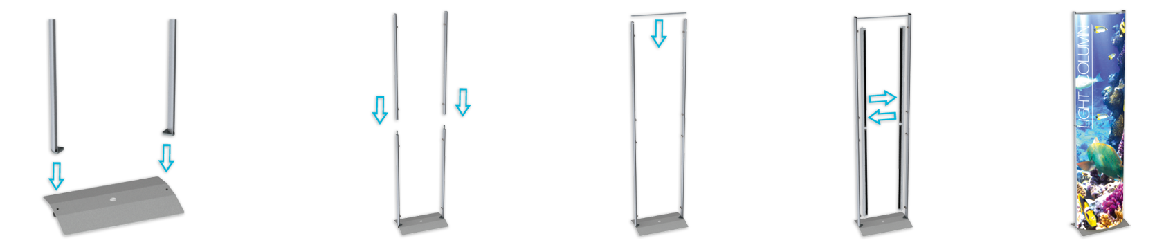 Die tragbare Lightcolumn besteht aus einer Basis, zwei zweiteiligen Stangen, einer oberen Verbindung, vier Lampen und zwei Grafikpaneelen.