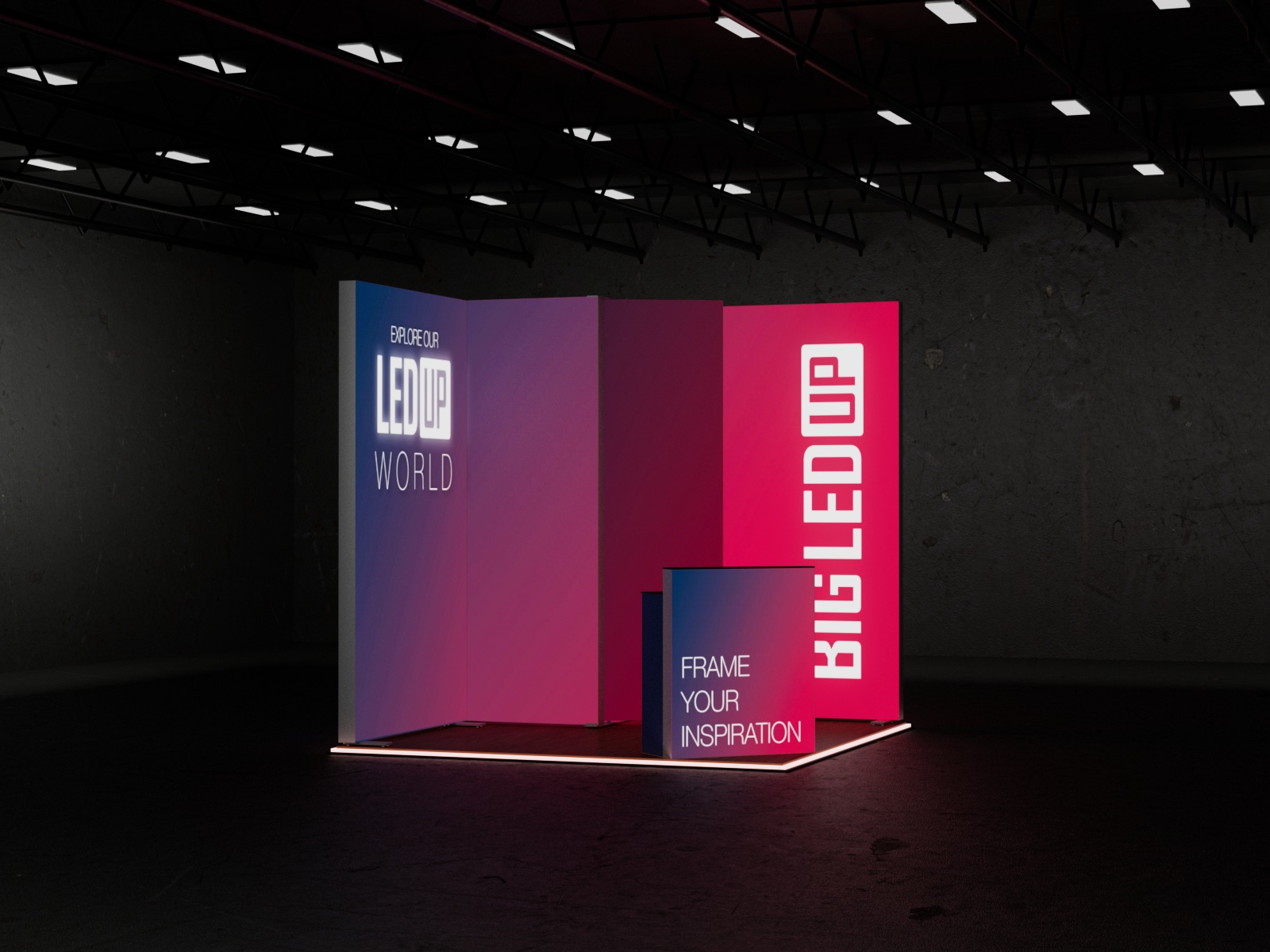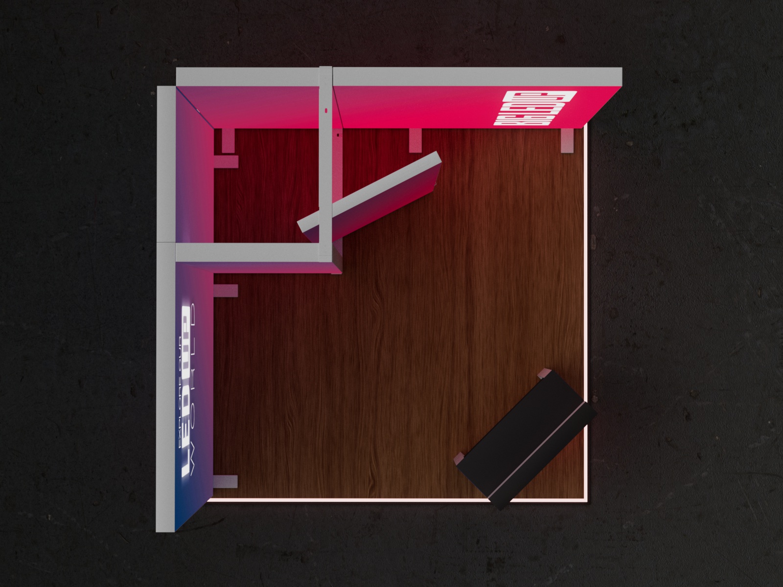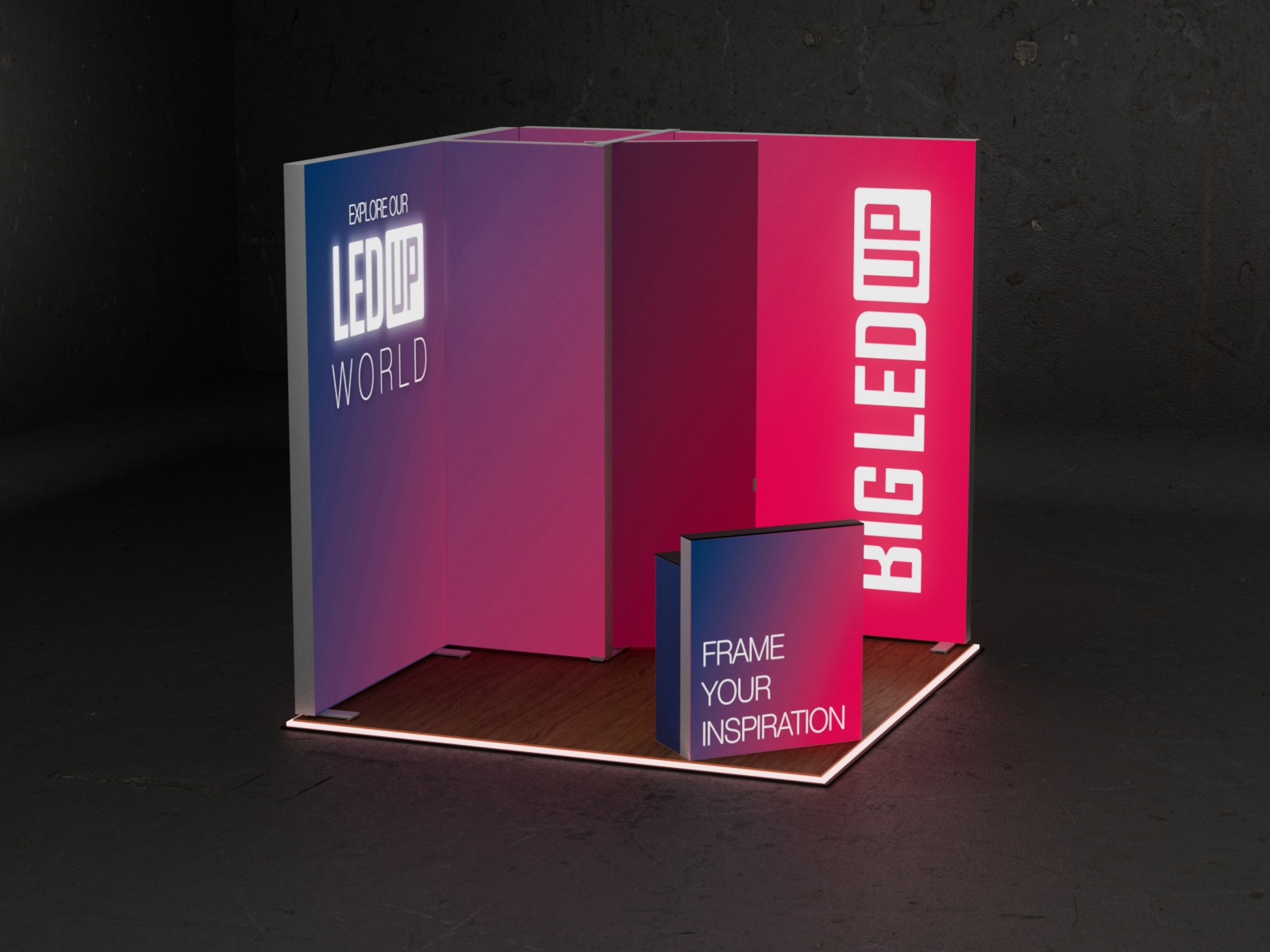 Dieses Set ist mit einer Grundfläche von 3x3 m und einer Höhe von 248 cm, sowie einem Counter MAX und einer Koje, eine kompakte Lösung für eine wirkungsvolle Präsentation.