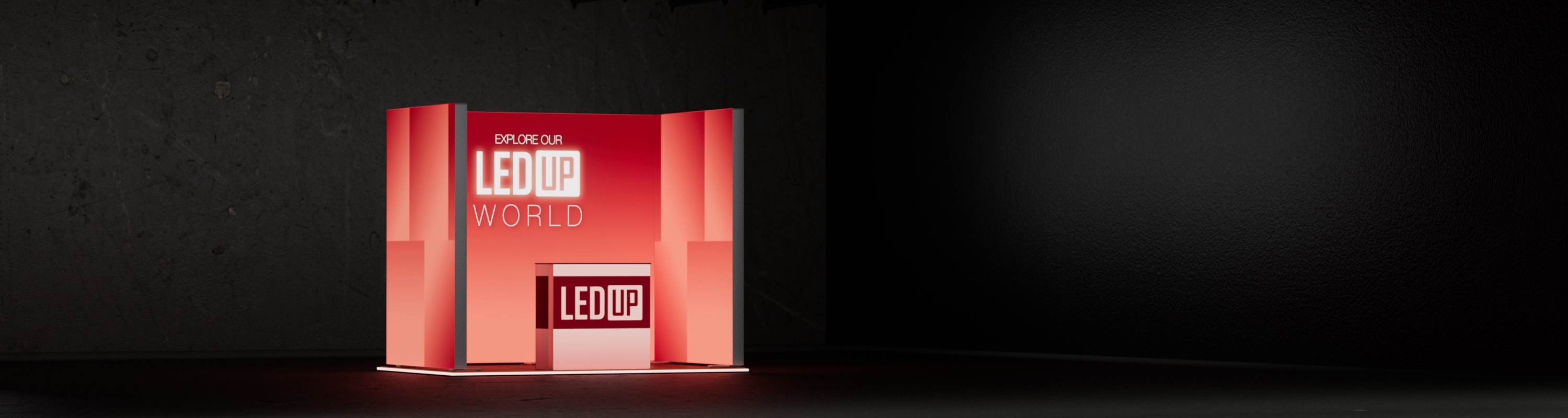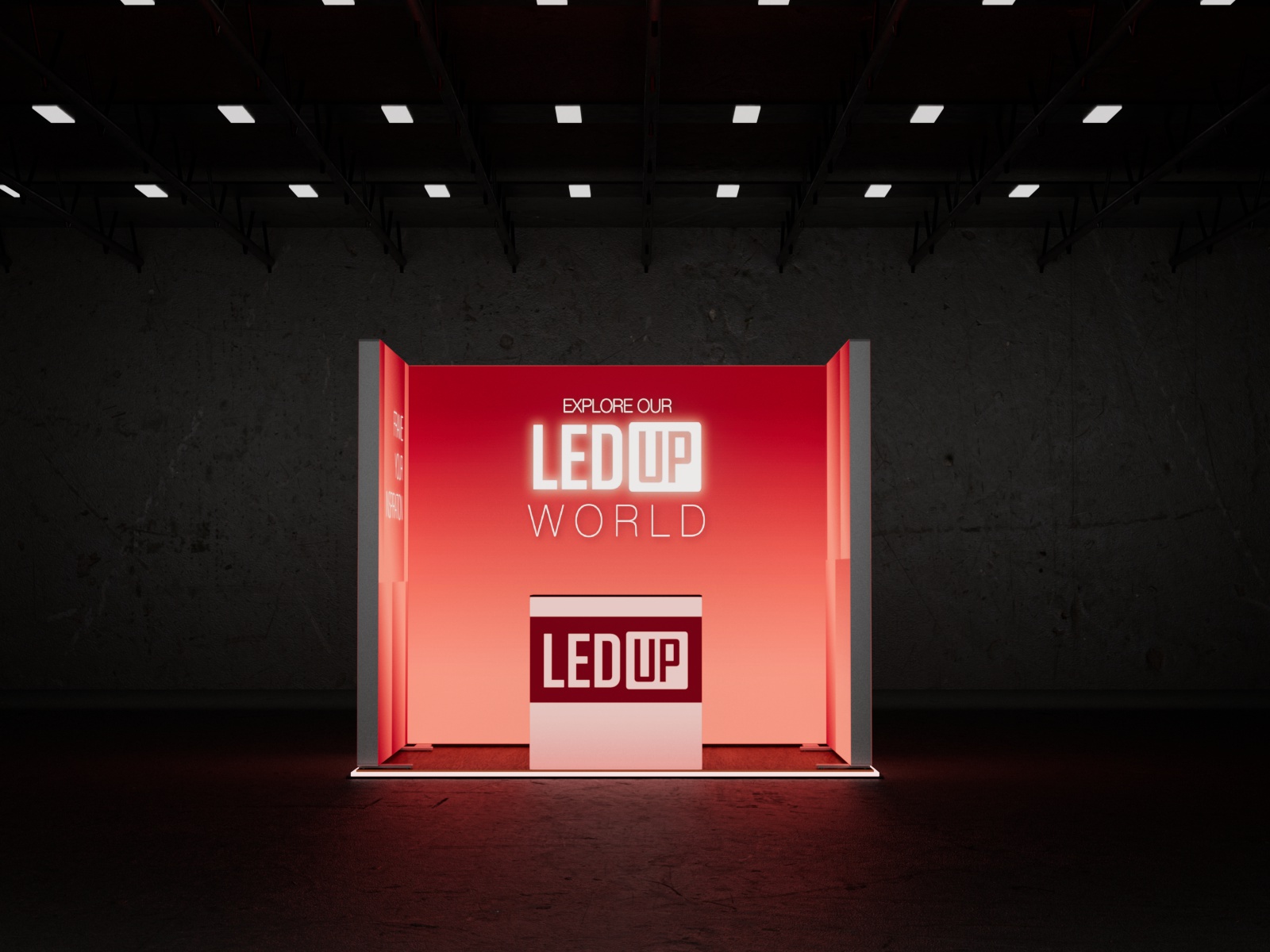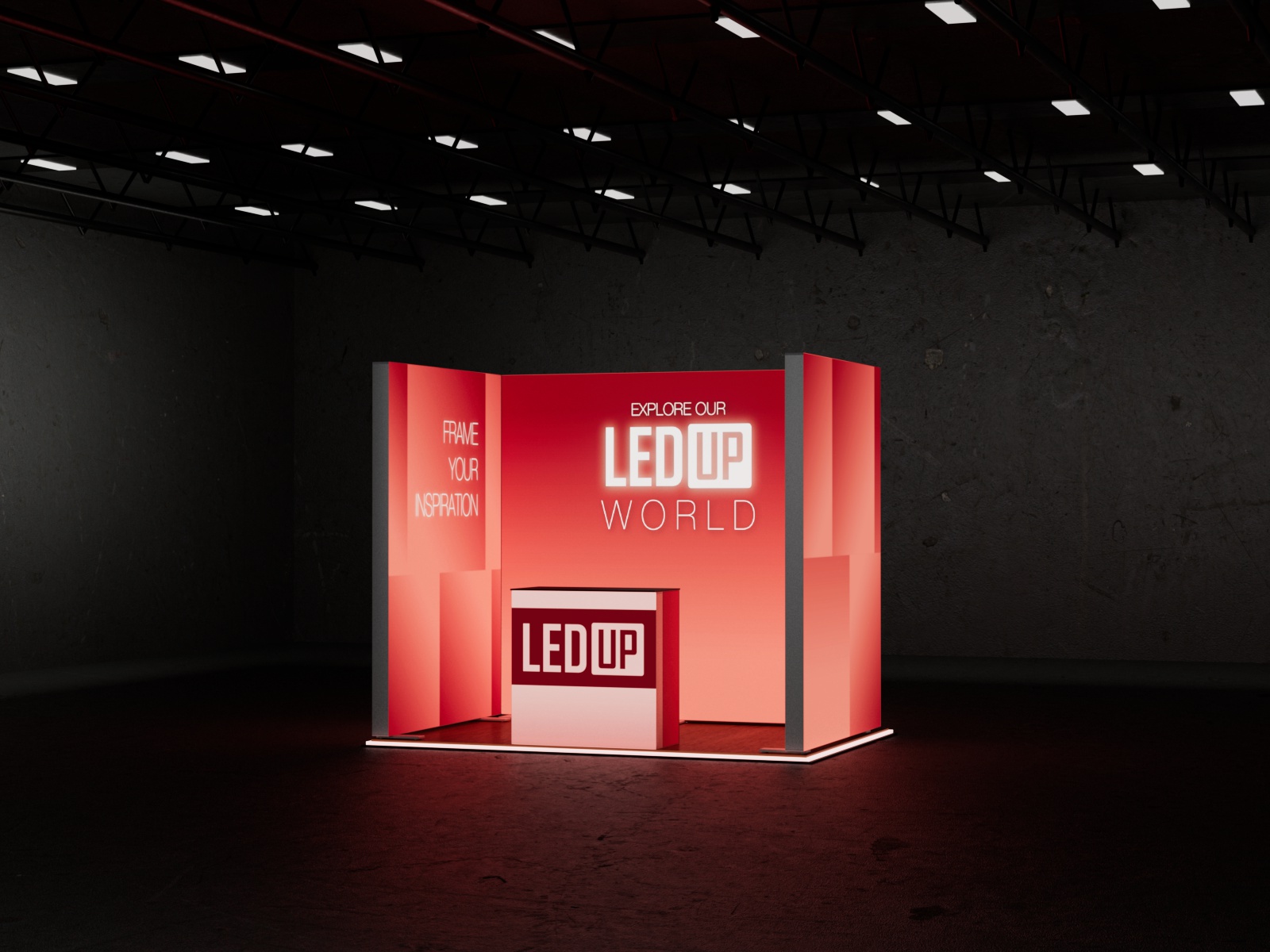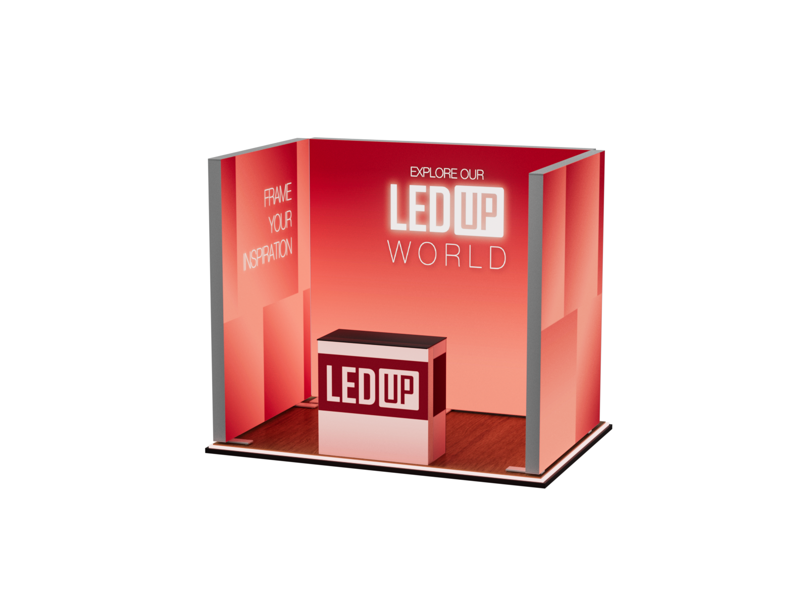 Dieses Set ist mit einer Grundfläche von 2x3 m und einer Höhe von 248 cm, sowie einem Counter ONE, eine kompakte Lösung für eine wirkungsvolle Präsentation.