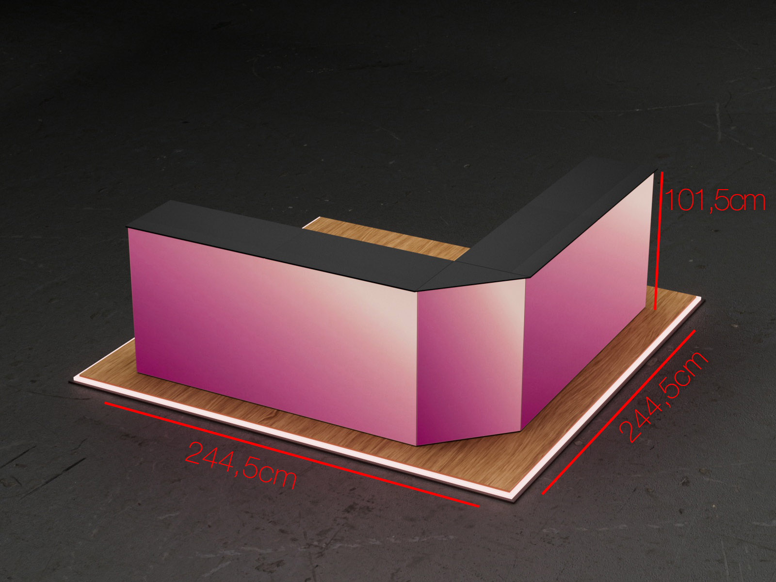 Das COUNTER LOLA Set bildet ein großzügiges und markantes L-förmiges Counter-Layout – perfekt für Eckstände, offene Beratungsflächen oder mehrseitige Produktpräsentationen. Es besteht aus vier COUNTER ONE Modulen, einem breiten Extension Set für eine gemeinsame Frontgrafik sowie einem Eckmodul für einen sauberen 90°-Übergang.